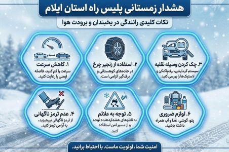 پلیس راه استان ایلام با صدور پیام ترافیکی به رانندگان عزیز هشدار می‌دهد که با توجه به برودت هوا و یخبندان در بعضی محور های مواصلاتی با احتیاط رانندگی کنند