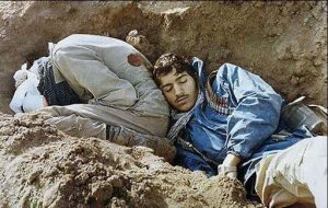 و اما ماجرای این عکس معروف، مربوط است به ۲۱ دی ماه سال ۶۵، سومین روز عملیات کربلای پنج در شلمچه است؛ وقتی که گروهی از نیروهای ایرانی در محاصره نیروهای عراقی گیر افتاده بودند. توی یکی از سنگرها، عباس حصیبی (شهید سمت چپ در عکس) و علی شاه آبادی (شهید سمت راست که یکی از سمینوف چی های دسته ادوات بوده)، کنار هم نشسته بودند که تیر سمینوف عراقی می خورد به سر حصیبی و رد می کند و می خورد به سر علی شاه آبادی…