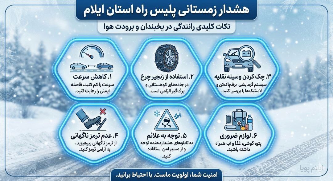 پلیس راه استان ایلام با صدور پیام ترافیکی به رانندگان عزیز هشدار میدهد که با توجه به برودت هوا و یخبندان در بعضی محور های مواصلاتی با احتیاط رانندگی کنند